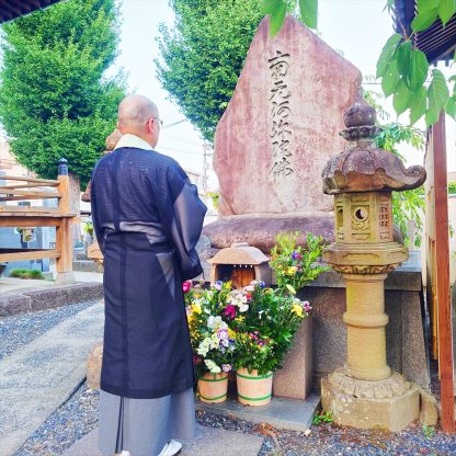 お天気が不安定ですが、晴れの間に永代合葬墓のお参りをさせて頂きました。今年もたくさんの方がお参り下さり、墓前はお華で賑やかです。